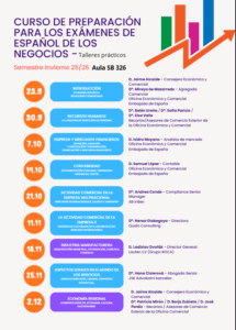 S novým semestrem si vás všechny opět dovolujeme pozvat na přednášky španělsky hovořících odborníků, které pro vás připravujeme ve spolupráci s Obchodním oddělením Španělské ambasády v Praze v rámci kurzu 2RO464 Preparación para los exámenes del espaňol de los negocios. Přednášky budou věnované španělské ekonomice a oblasti podniku a jsou volně přístupné, jste tedy všichni srdečně vítáni! Počet posluchačů je omezen pouze kapacitou místnosti. Přednášky se budou konat vždy v úterý 9.15 – 10.45 v učebně 326 SB a kompletní program pro celý semestr naleznete níže.